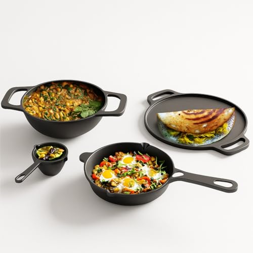 Lifelong Cast Iron Cookware Combo Set | 4-Piece Pre-Seasoned – Tawa (30Cm), Kadhai (24Cm), Fry Pan (20Cm) & Tadka Pan | Naturally Non-Stick | Gas & Induction Compatible, Black is available on Amazon at best discounted online price. Original of this product is ₹ 5999.0. You can buy this product at discounted rate ₹ 2530.