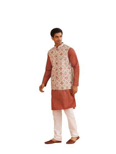 Sojanya (Since 1958 Men’S Cotton Linen Maroon Kurta And White Pyjama With Cream Cotton Nehru Jacket is available on Amazon at best discounted online price. Original of this product is ₹ 6499.0. You can buy this product at discounted rate ₹ 1886.