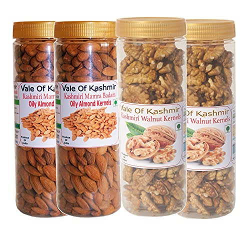 Vale Of Kashmir Kashmiri Mamra Almonds Badam Kernels And Kashmiri Walnut Kernels 1Kg In Jar Pack Of 4 Kashmiri Badam Giri & Kashmiri Akhrot Giri is available on Amazon at best discounted online price. Original of this product is ₹ 2999.0. You can buy this product at discounted rate ₹ 549.